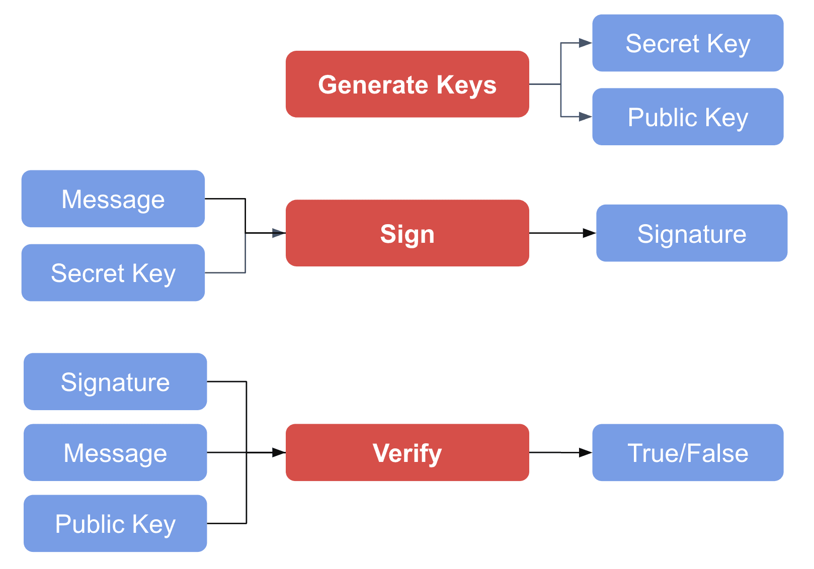 • Sign(Message, Private Key) => Signature: This algorithm is used by the owner of the private key to create a digital signature for a message. The signature is generated based on the private key and the content of the message. The signature is typically appended to the message before transmission.